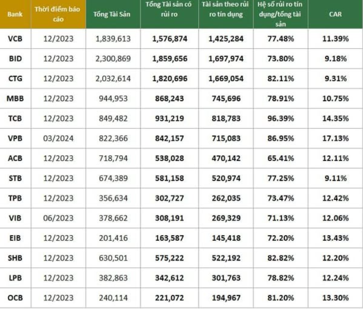 Tính theo trọng số rủi ro tài sản, TCB (Ngân hàng Techcombank) vẫn dẫn đầu, với thành tích carry (giữ) rất nhiều tài sản thuộc nhóm trọng số trên 200% (từ một công ty niêm yết tại US - Mỹ). ACB (Ngân hàng Á Châu) vẫn giữ vững vị trí bank (ngân hàng) an toàn nhất hệ thống với trọng số rủi ro chỉ 65%. Với tốc độ tăng trưởng tín dụng không quá thấp, chưa đến mức mature (chín muồi), mà tài sản an toàn thế này, thì ACB rất đáng khen.