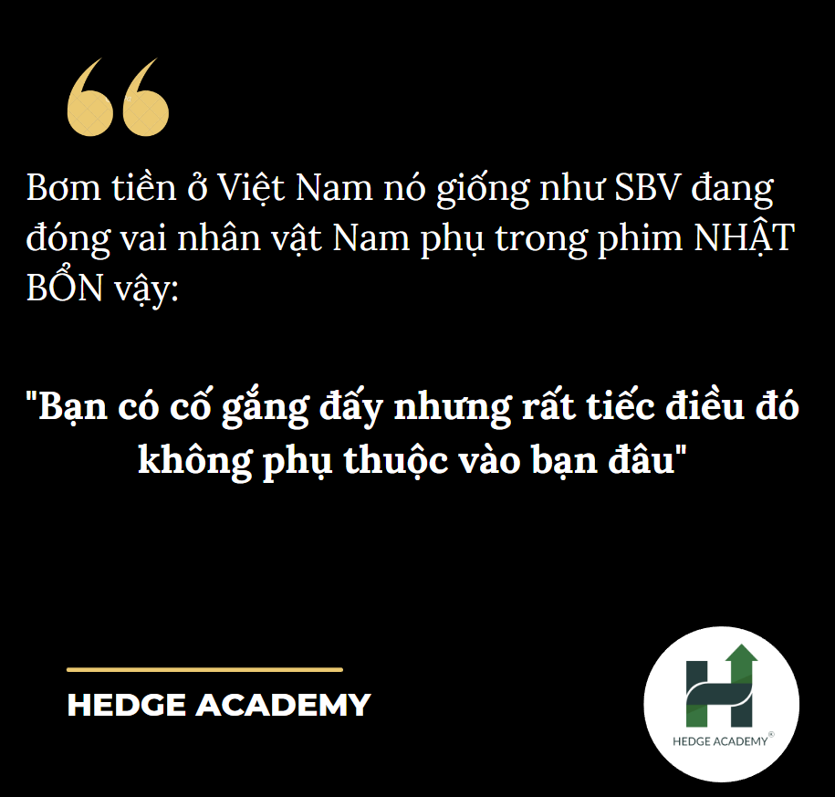 Rồi bây giờ chúng ta mới nói này, ở Việt Nam thì cái dạng 1 nó là không có, mà thay vào cái chỗ Securities (Chứng khoán) kia ấy là USD, là flow (dòng tiền). Việt Nam chỉ thực sự "bơm tiền" khi có flow (dòng tiền) mà thôi. Hiểu không? Nên là mấy cái OMO (Open Market Operations - Hoạt động thị trường mở) thanh khoản ấy không có phải là bơm tiền đâu, mà nếu có outflow (dòng tiền ra) là thành thu hẹp cân đối đấy. Nên cho ai thắc mắc về chuyện các chuyên gia nói về bơm tiền, hầu hết người nói về bơm tiền thì chưa từng đi bơm tiền (bán USD cho SBV - Ngân hàng Nhà nước Việt Nam). Đấy, đại cương về bơm tiền là vậy. Còn để hiểu về các biến số, biểu hiện, kết quả... của bơm tiền thì chắc là mất thời gian hơn (cái này Hedge có dạy).