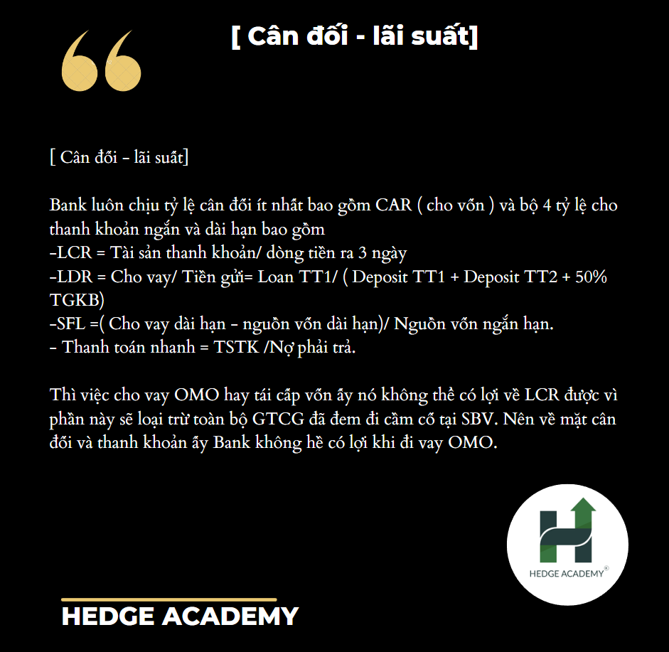 Thì việc borrow (vay) OMO (Open Market Operation - Nghiệp vụ Thị trường Mở) hay refinancing (tái cấp vốn) ấy, nó không thể benefit (có lợi) về LCR, vì phần này sẽ exclude (loại trừ) toàn bộ GTCG (Giấy tờ có giá) đã đem đi pledge (cầm cố) tại SBV (State Bank of Vietnam - Ngân hàng Nhà nước Việt Nam). Và cũng không benefit (có lợi) về LDR. Nên về mặt balance (cân đối) và liquidity (thanh khoản), Bank không hề benefit (có lợi) khi borrow (vay) OMO.