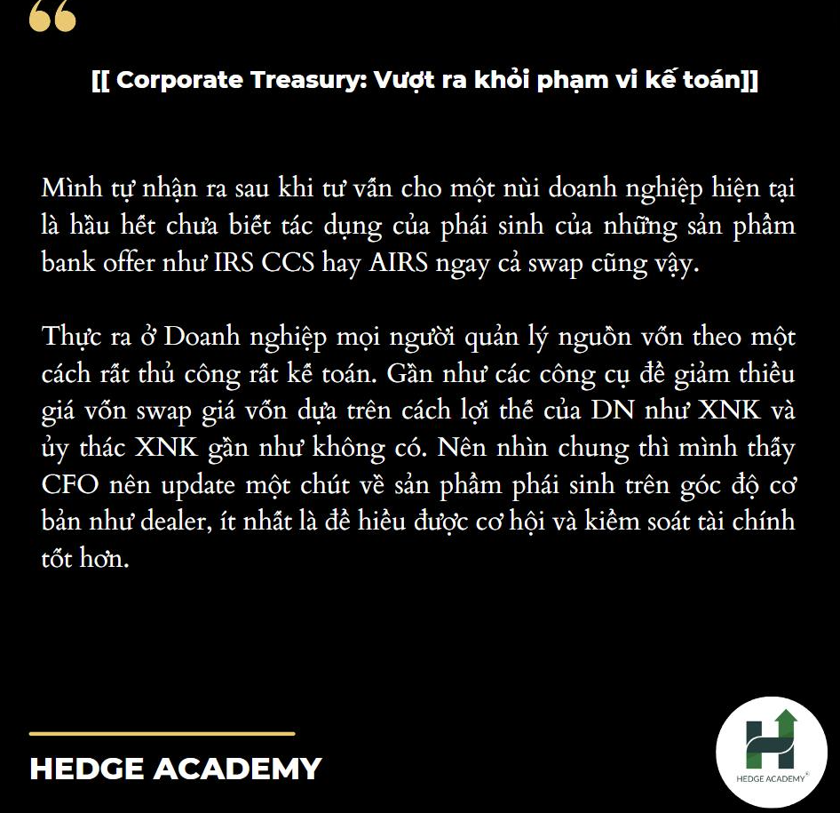 Thực tế, các doanh nghiệp quản lý nguồn vốn rất thủ công, kiểu rất kế toán. Gần như không sử dụng công cụ nào để giảm thiểu giá vốn, swap giá vốn dựa trên lợi thế của doanh nghiệp như XNK (xuất nhập khẩu) hay ủy thác XNK. Nên mình thấy CFO (Chief Financial Officer - giám đốc tài chính) cần update (cập nhật) kiến thức về sản phẩm phái sinh ở góc độ cơ bản như dealer (người giao dịch), ít nhất để hiểu cơ hội và kiểm soát tài chính tốt hơn.