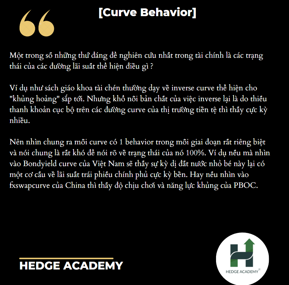 Nói chung, mỗi đường cong (curve) có một hành vi (behavior) riêng trong từng giai đoạn, rất đặc trưng và khó có thể nói rõ trạng thái của nó một cách chính xác 100%. Ví dụ, nếu nhìn vào Bond Yield Curve (Đường cong Lợi suất Trái phiếu) của Việt Nam, sẽ thấy sự kỳ lạ: một đất nước nhỏ bé như Việt Nam lại có cơ cấu lãi suất trái phiếu chính phủ (GOVIBOND) cực kỳ bền vững. Hoặc nếu nhìn vào FX Swap Curve (Đường cong Lãi suất Hoán đổi Ngoại hối) của Trung Quốc, sẽ thấy độ chịu chơi và năng lực mạnh mẽ của PBOC (People’s Bank of China - Ngân hàng Nhân dân Trung Quốc). Mọi người có thể đọc thêm các bài viết học thuật về trạng thái lãi suất trên Facebook anh Trần Quang Nghĩa: