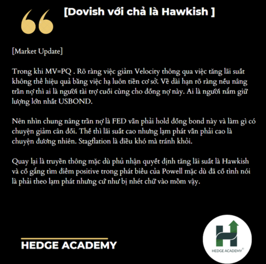 Quay lại chuyện truyền thông, dù họ phủ nhận quyết định tăng lãi suất là Hawkish (Chính sách Diều hâu - Thắt chặt tiền tệ) và cố gắng tìm điểm tích cực (positive) trong phát biểu của Powell, nhưng Powell đã cố tình nói rằng phải bám sát lạm phát, vậy mà truyền thông cứ như bị nhét chữ vào mồm vậy.