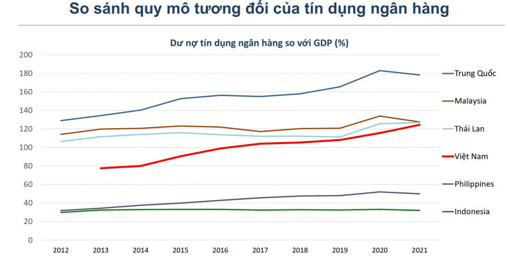 Tự nhiên mình thấy cái biểu đồ (chart) này. Nhìn biểu đồ này thì nói chung hơi bị khập khiễng. Nhìn vào, bạn sẽ thấy wow, dư nợ tín dụng của Việt Nam so với GDP cao thật đấy, đúng không? Nhưng cái này rất khó nói, vì còn một phần rất lớn từ hệ thống ngân hàng ngầm (shadow bank) không được thống kê.