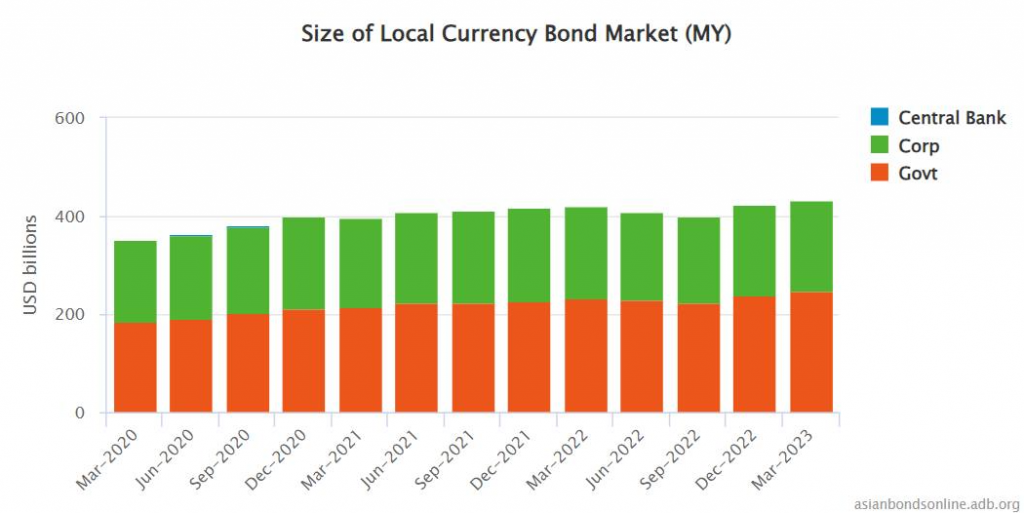 Ví dụ, ngay bên dưới là biểu đồ của Malaysia, quy mô thị trường trái phiếu doanh nghiệp (TPDN) của họ là 185 tỷ USD, lớn gấp hơn 3 lần quy mô của Việt Nam và bằng gần một nửa GDP của họ (373 tỷ USD). Trong khi đó, quy mô TPDN của Việt Nam thì thấp, chỉ rơi vào khoảng 49-50 tỷ USD gì đó và đang bị giảm. Đâm ra, một cái biểu đồ nói quy mô dư nợ này mà bảo Việt Nam “high leverage” (đòn bẩy cao) thì không đúng cho lắm. À nhân tiện, mọi người có thể tham khảo thêm ở đây: