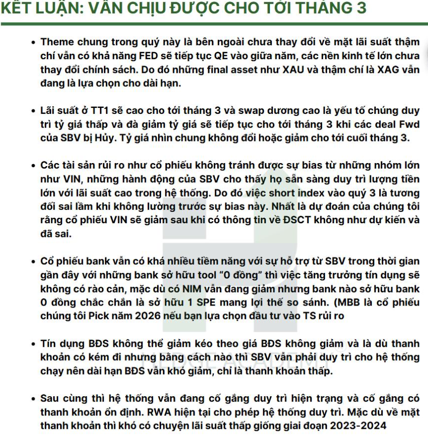 Update lần 2 – “Lãi suất sẽ giảm sớm thôi” (10/2): tại thời điểm này lãi suất đã là swap ON (qua đêm) ~5.0 và 1Y ~3.7, curve inverse (đường cong lãi suất đảo ngược) ngay trước Tết. Khi SBV có tín hiệu offer swap (bơm thanh khoản), assumption thay đổi. Kết luận: lãi suất TT2 giảm trước Tết, tỷ giá có thể tăng lại khi swap ON về 0, và đây là thời điểm tốt để nghĩ về tài sản rủi ro như đã trình bày trong Report Q1. (Thực tế update này khá sát khi ngay sau đó TT2 giảm, thanh khoản dồi dào, MBB tăng mạnh).
