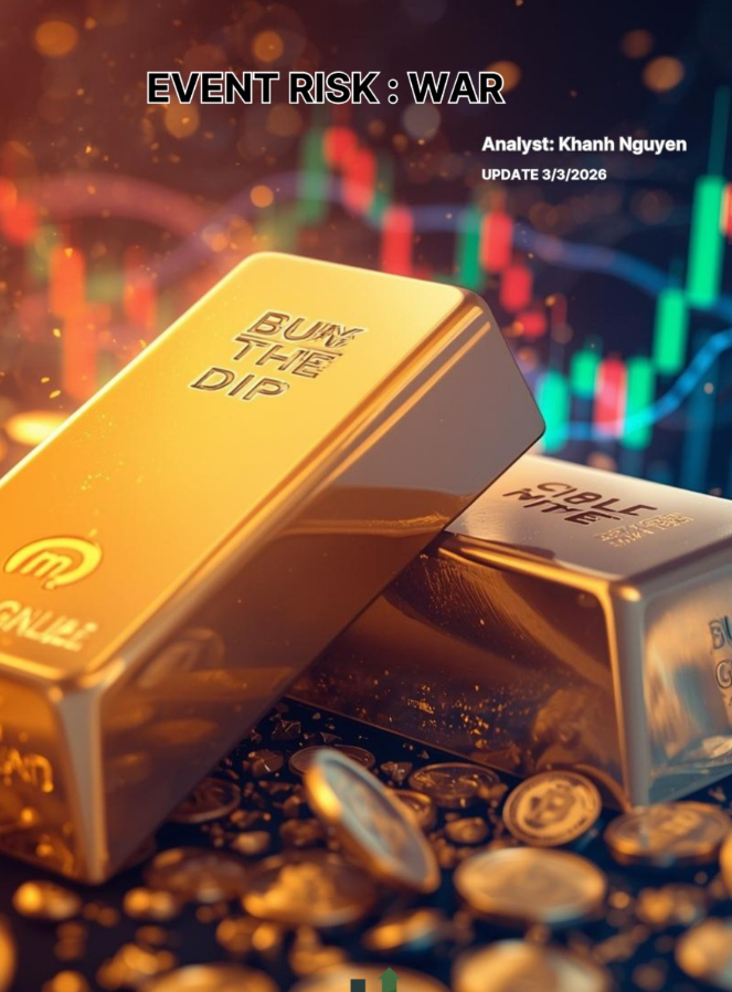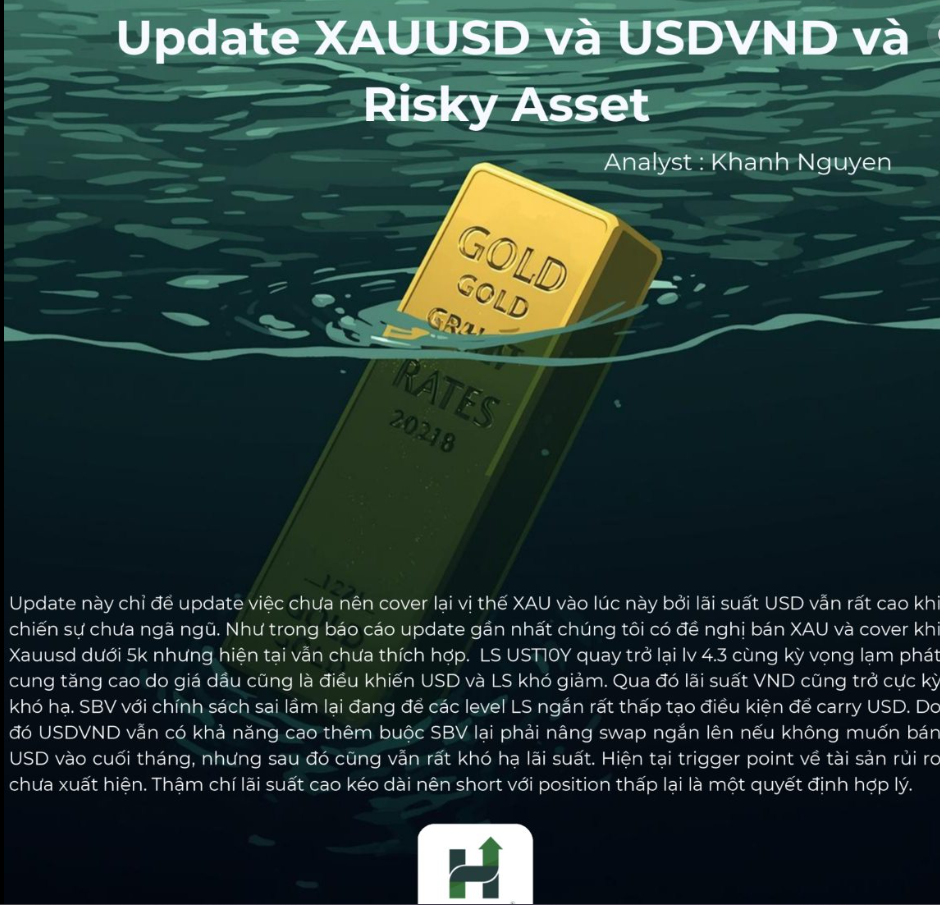 Update lần 4 – “Event Risk: War” (3/3): chiến tranh → bán XAU tại 5k3 vì giá tăng do chiến tranh không bền vững, cover (mua lại) khi dưới 5k, đồng thời đóng trạng thái risky asset do UST yield (lợi suất trái phiếu Mỹ) tăng và lãi suất bị repricing (định giá lại). Có chỉ trích SBV khi không kiểm soát được thanh khoản ngắn hạn.