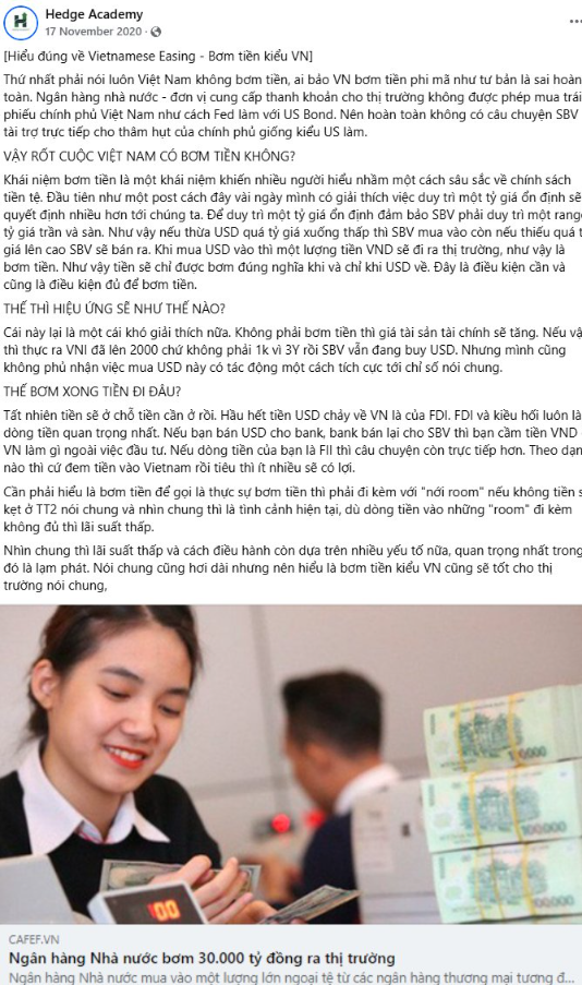 Mình chắc chắn 1000% đây là bài viết đầu tiên phổ cập về chuyện Bơm Tiền kiểu Việt (Vietnamese Easing - Nới lỏng tiền tệ kiểu Việt Nam) tại Việt Nam và định nghĩa như thế nào mới là bơm tiền và Admin gặp một trường hợp thú vị lấy chính kiến thức từ đây để nói rằng Việt Nam không bơm tiền, lấy chính cái bài viết này ra cãi nhau với mình về chuyện... không mua USD mà bán USD mấy năm nay sẽ là không bơm, mà ngược lại còn hút tiền. Haha ...Ờ Chính sách tiền tệ mỗi năm một khác và đúng là hiện tại người ta không bơm theo kiểu cách đây 5 năm, nói chính xác hơn thì người ta đã thay đổi cái Framework (khung chính sách) đi quá nhiều khiến cho việc "BƠM" nó không còn constrain (ràng buộc) về "NGOẠI SINH" (Exogenous - Bơm tiền từ yếu tố bên ngoài) mà chuyển về "NỘI SINH" (Endogenous - Bơm tiền từ yếu tố nội tại) với đặc trưng lớn hơn về Velocity (vận tốc tiền tệ). Nếu có chưa đọc Update thì ở đây: https://shorturl.at/AK21M. Để cãi nhau cho đúng còn nếu không thì đi học là tốt nhất. Vì mỗi năm nó sẽ thay đổi mỗi khác. Cái không thay đổi là chúng ta chứ chính sách đúng mỗi năm là một cái khác hẳn. Điều này không chỉ đúng với Việt Nam. Cả US (United States - Hoa Kỳ), China (Trung Quốc)... tất cả mọi nơi đều vậy. Thay vì tìm cách bơm thêm tiền mới thì đều hướng tới tăng thật lớn vòng quay, điều này vô tình lại khiến final asset (tài sản cuối cùng) của các CB (Central Bank - Ngân hàng Trung ương) trở nên càng ngày càng có "giá" hơn. Nhưng phải nhắc lại là người ta bơm một, ông Việt Nam bơm còn ác liệt hơn. Dự kiến tín dụng cuối năm sẽ tầm 20%, một con số rất rất kỷ lục. Thực tế thì mọi người đã thấy lạm phát tiết kiệm (shrink inflation - thu hẹp lạm phát) từ giá điện, bát phở, helicopter money (tiền trực thăng - phát tiền trực tiếp) dễ dàng..., hiểu dân dã là kinh tế thì nát nhưng tiền bơm ra thì lắm.