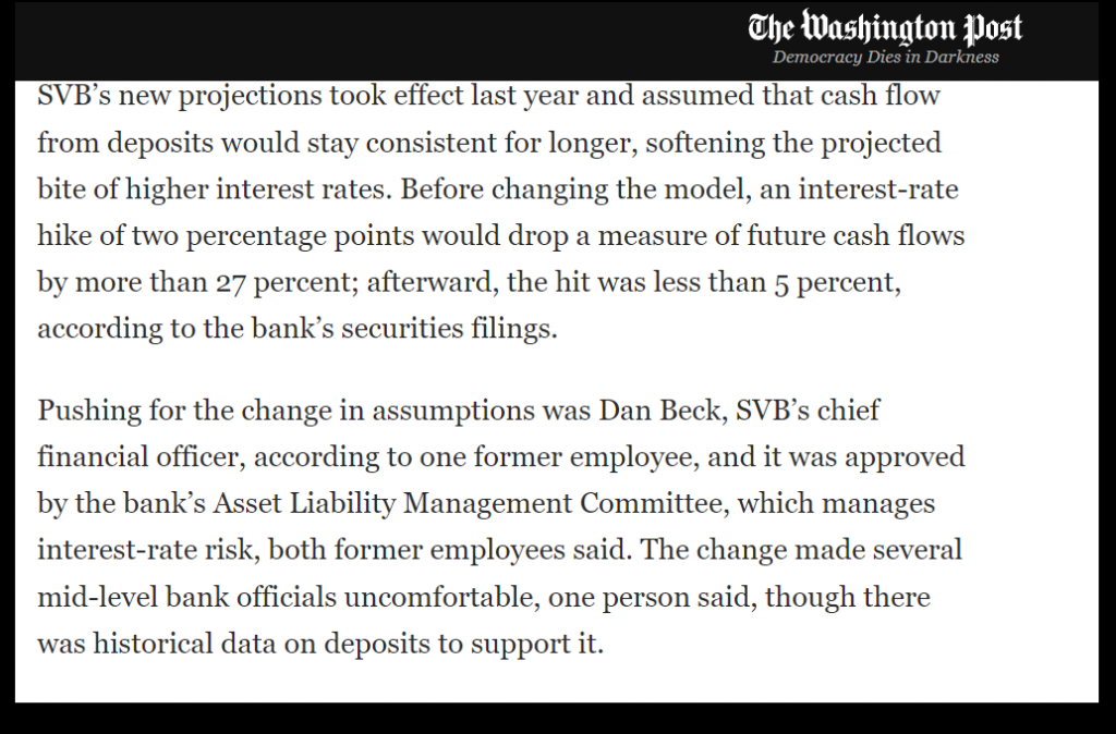 Old model (mô hình cũ) thì give (cho ra) bad result (kết quả xấu), customers (khách hàng) withdraw money (rút tiền) khi interest rate increases (lãi suất tăng). Thế là SVB’s CFO (CFO của SVB), CFO nhé, not CRO (Chief Risk Officer - Giám đốc Rủi ro), pushing change (đẩy thay đổi) freaking assumptions (giả định) của model thành no impact (không ảnh hưởng) (à, chỉ slight impact (ảnh hưởng nhẹ)) và only explain vaguely (chỉ giải thích đại khái) kiểu… behavioral model (mô hình hành vi).