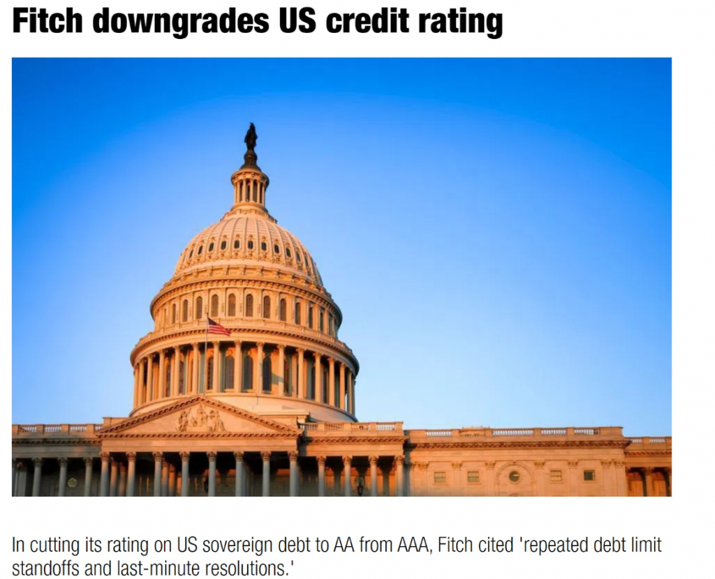 “Downgraded: The US has been stripped of its top-tier sovereign credit rating by Fitch Ratings, echoing a move made more than a decade ago by S&P. The credit assessor downgraded the US to AA+ from AAA — a ranking the nation has held at Fitch since at least 1994 — in the wake of major political battles over the nation’s borrowing and repeated standoffs over raising the debt limit. While the most recent legislative impasse was resolved, it remains a potential issue of concern going forward. The assessor has a stable outlook on the country.”