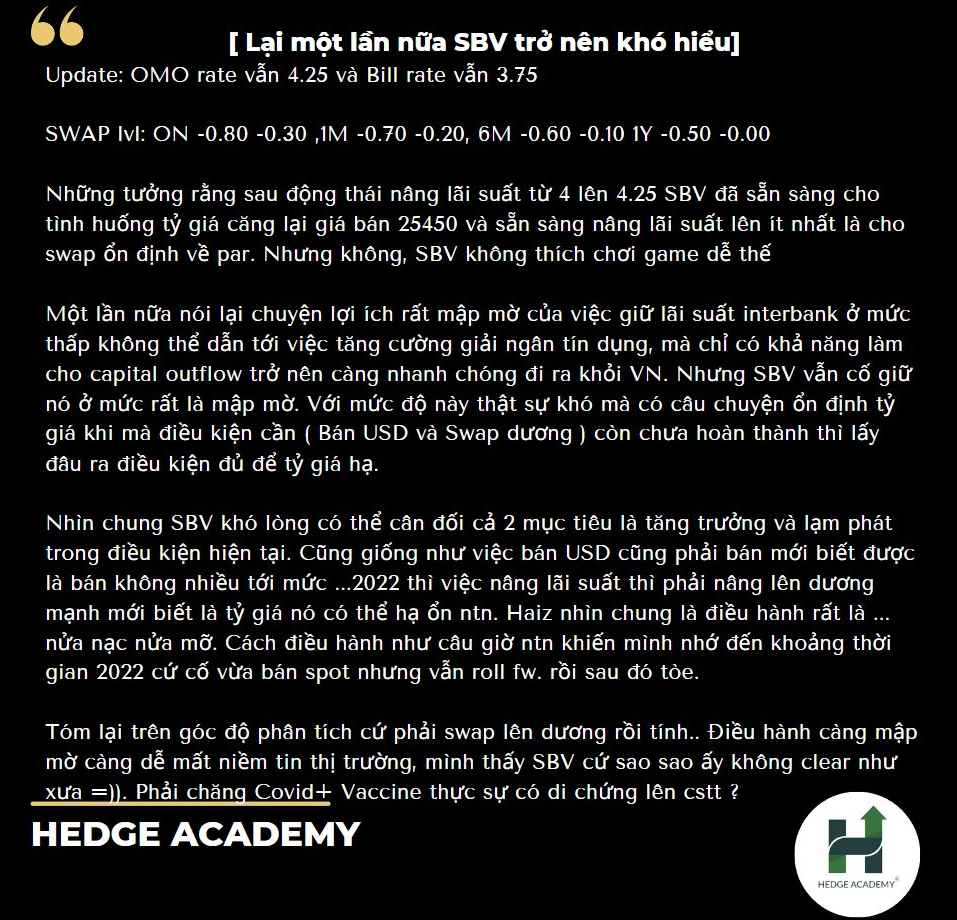 Nghĩ rằng sau động thái nâng lãi suất từ 4% lên 4.25%, SBV (Ngân hàng Nhà nước) đã sẵn sàng cho tình huống tỷ giá căng, với giá bán 25.450 và sẵn sàng nâng lãi suất ít nhất để swap (hợp đồng hoán đổi) ổn định về par (mức cân bằng). Phó Thống đốc cũng lên tiếng khẳng định không bỏ mục tiêu tỷ giá. Nhưng không, SBV không thích chơi game dễ thế!