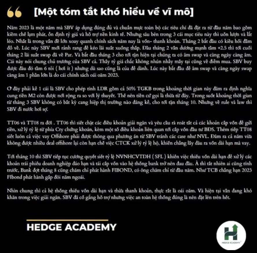 So với năm ngoái, năm nay SBV không có gì để chê. Dù TT06, TT08 và không gia hạn SFL khiến thị trường thiếu vốn đôi chút, nhưng điều này là cần thiết. Nhìn chung, SBV vẫn đúng, vẫn chuẩn.