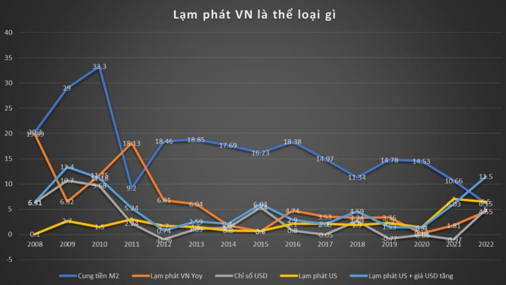 - Trước 2015, cụ thể 2008-2015, lạm phát tổng cầu ảnh hưởng đến tổng cung. Do bơm tiền quá lớn, giá USD tăng trung bình 4.4%/năm, kéo theo giá NVL (nguyên vật liệu) đầu vào tính bằng USD tăng mạnh. Lạm phát này đúng là từ tổng cầu.