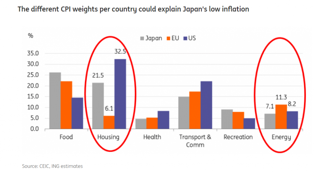 Cái hình này để giải thích tại sao BOJ (Bank of Japan - Ngân hàng Trung ương Nhật Bản), ECB (European Central Bank - Ngân hàng Trung ương châu Âu) hay mấy nước khác lại có monetary policy (chính sách tiền tệ) lệch pha với Fed (Cục Dự trữ Liên bang Mỹ), dù đều dùng Inflation Target (Mục tiêu lạm phát). Cốt lõi là vì trọng số trong inflation basket (rổ lạm phát) của tụi nó khác nhau nhiều. Thế nên Nhật Bản mà lạm phát không cao thì họ tăng interest rate (lãi suất) làm gì?