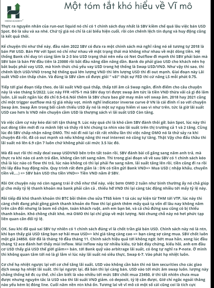 Mà đã out (dòng tiền ra) rồi, thì mấy deal (giao dịch) swap (hoán đổi) USD/VND bên trên tất toán rồi, SBV đánh bài cố gắng sang năm anh trả, mà thực ra khi nào có anh trả dần, không cần tới sang năm. Thì trong giai đoạn về sau, SBV có 1 chính sách kéo thả, là lúc nào có flow (dòng tiền) thì trả, lúc nào không có thì lại phải FW (Hợp đồng kỳ hạn) sang năm. Lãi suất tăng lên rồi, tiền cũng đi ra rồi, thì lấy đâu huy động nữa. Quy trình rất đơn giản là: Doanh nghiệp có tiền gửi bank (ngân hàng) VND => Mua USD (nhập khẩu, chuyển tiền về,...) => SBV bán USD thu tiền VND => Tiền VND nằm ở SBV.