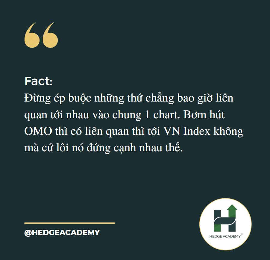 Cái ý kiến này mình vừa mới gặp trong một group (nhóm). Đấy, xong rồi có ông còn gán cả tỷ giá USDVND vào với thị trường cho nó chuẩn. Không, thực ra USDVND thì có liên quan đấy nhưng xin đừng gán nó lại nữa. Năm ngoái có một giọt OMO (hoạt động thị trường mở) nào đâu mà thị trường vẫn tăng mà. Sao lại cố gán ghép lại.