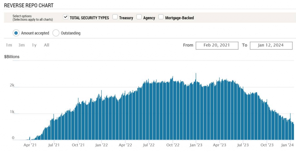 Dù fixing (định giá lãi suất) có biến động trước và sau CPI (Consumer Price Index - chỉ số giá tiêu dùng), nhưng khó có một chu kỳ lãi suất rẻ nữa. Lãi suất dài hạn fixing cho SOFR (Secured Overnight Financing Rate - lãi suất qua đêm có bảo đảm) chắc chắn trên 3.5%. Với trạng thái hiện tại, hạ lãi suất ngay là rất khó. Nhưng tin vui là lượng tiền thừa trong RRP (Reverse Repurchase Agreement - thỏa thuận mua lại ngược) đang giảm nhanh, chỉ còn khoảng 600 tỏi (nghìn tỷ) USD. RRP tương đương Citad (cầu tín dụng liên ngân hàng) Việt Nam, vốn thừa khoảng 400k (400 nghìn tỷ VND, tức 16 tỏi USD). Nếu so tương đương GDP Việt Nam = 1/64 GDP Mỹ, thì Việt Nam đang thừa tiền hơn Mỹ, haha!