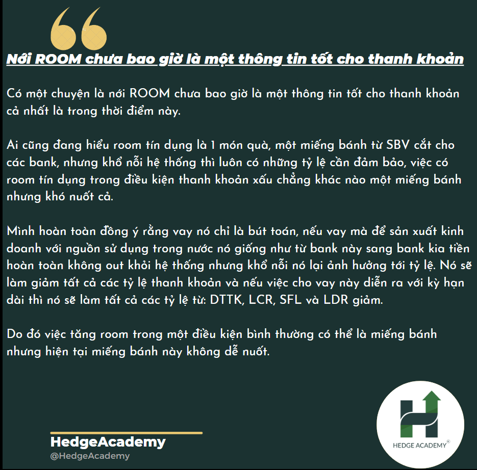 Ai cũng đang hieo room (hạn mức) tín dụng là 1 món quà, một miếng bánh từ SBV (Ngân hàng Nhà nước Việt Nam) cắt cho các bank (ngân hàng). Nhưng không, hệ thống thì lượng có nhưng tỷ lệ căng đét bao, việc có room (hạn mức) tín dụng trong điều kiện thanh khoản không khác nào một miếng bánh nhúng nước cả.