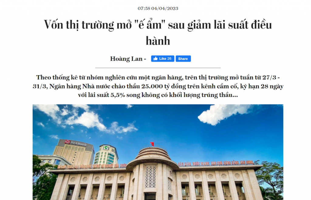 FACT (SỰ THẬT): SBV lowers operating interest rate (hạ lãi suất điều hành), reduces (giảm) OMO interest rate (lãi suất Nghiệp vụ Thị trường Mở) xuống, nhưng không mean (có nghĩa) là inject money (bơm tiền). Specifically (cụ thể), SBV có thể không lower interest rate (hạ lãi suất), mà release (thả) phần bill outstanding (tín phiếu đang lưu hành) hiện tại ra, thì Interbank rate (lãi suất liên ngân hàng) vẫn go down (xuống). SBV không even (thậm chí) intervene (tác động) bằng interest rate (lãi suất), mà intervene (tác động) bằng money supply (lượng tiền). Thế nên mới có cái news article (bài báo) như dưới. Và cái này là inject liquidity (bơm thanh khoản), không phải inject money (bơm tiền). To lend (để cho vay) được, cần có ratio (tỷ lệ).