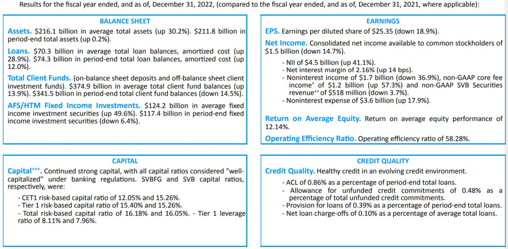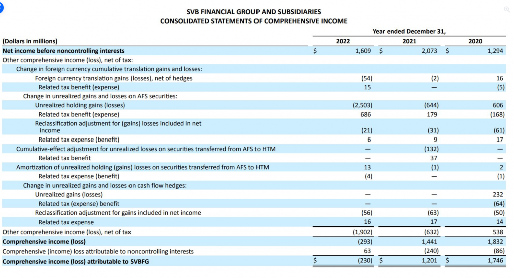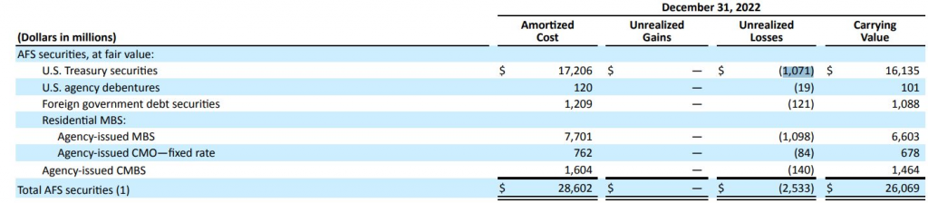 Unrealized P&L (Profit and Loss - Lợi nhuận và lỗ chưa thực hiện) của họ trên OCI (Other Comprehensive Income - Thu nhập toàn diện khác) từ dương 1.2 billion USD (1.2 tỷ Đô la Mỹ) năm trước, giờ thành âm 230 million USD (230 triệu Đô la Mỹ), vì chịu khoản lỗ 2.5 billion USD (2.5 tỷ Đô la Mỹ) từ AFS (Available-for-Sale - Tài sản tài chính sẵn sàng để bán). Mà danh mục AFS của họ toàn là US Treasury Security (Trái phiếu Kho bạc Mỹ), Agency MBS (Mortgage-Backed Securities - Chứng khoán hóa thế chấp do cơ quan chính phủ bảo lãnh)... mà lỗ này là lỗ đánh giá lại, chứ không phải lỗ thực tế kiểu bad debt (nợ xấu).