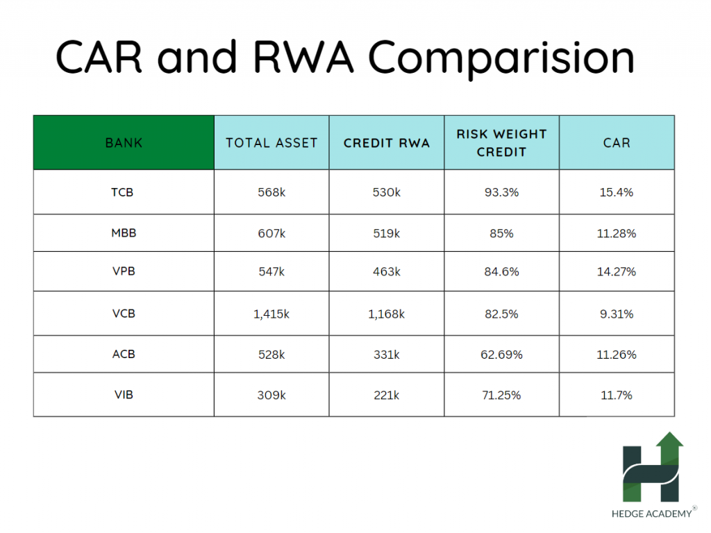 Chuyện là buổi sáng mình có nói là nó rất hay, chiều mình dạy bank (ngân hàng) đúng học phần này, ngồi làm luôn cái bảng so sánh tương đối. Thì bạn thấy vì sao CAR (Capital Adequacy Ratio - Tỷ lệ an toàn vốn) TCB (Techcombank) to mà ACB (Ngân hàng Á Châu) lại được coi là bank (ngân hàng) an toàn chưa? Nhìn vào đây thấy luôn này.