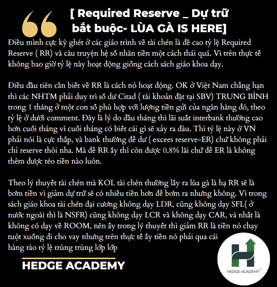 Dù Page đã nói rất nhiều lần rằng DTBB (Dự trữ Bắt buộc) của Việt Nam rất thấp, giảm cũng chẳng để làm gì, nhưng vẫn có bạn bảo lấy số liệu ra xem. Hiện tại, DTBB của Việt Nam với tiền gửi dưới 12 tháng (12M) chỉ là 3%, và các ngân hàng Big4 (4 ngân hàng lớn: Vietcombank, BIDV, Agribank, VietinBank) thường xuyên để ER (Excess Reserve - Dự trữ Thừa, tức số dư vượt DTBB tại SBV). KBNN (Kho bạc Nhà nước) thì có số dư lớn trong hệ thống, vậy không hiểu giảm DTBB thì để làm gì?