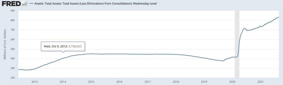 Quay lại một chút về việc Tapper và Tightening. Tapper là bạn đóng van không thực hiện đi kèm hành động về lãi suất nhưng vẫn kiểm soát lãi suất mức lãi suất mục tiêu, cũng gần đây thôi Fed cũng thực hiện tương tự nhưng chiều ngược lại tức ngừng Quantitative Tightening nhưng không đi kèm lãi suất được điều chỉnh. Ví dụ mình hay lấy ra làm ví dụ cho học viên là khoảng thời gian từ đầu 2019 - giữa 2019, Fed ngừng lại việc nâng lãi suất nhưng Cân đối lại thu hẹp (Hình dưới) bởi vì khi đó lượng tiền vẫn dư tương đối do đó việc dừng tăng lãi suất chỉ dẫn tới định hướng về lãi suất. Còn định hướng về lượng tiền thì lượng tiển sẽ giảm cân đối thu hẹp mặc dù không có động thái lãi suất đáng kể. Ngược đời đúng không vì trong suốt khoảng thời gian Tighten trước đó cân đối lại không biến động nhiều như lúc đã ngừng Tightening. Người ta rất hay gọi các trạng thái này là Normalization tức là bình thường hoá cân đối.