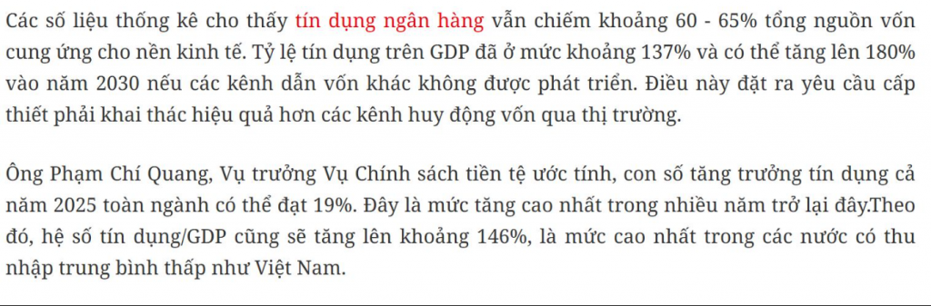 Nói chung gần đây sau khi Vụ trưởng Vụ CSTT (Chính sách tiền tệ - Monetary Policy Department) lên tiếng về Tín dụng/GDP thì hầu như các chuyên gia đều lên tiếng đi theo vấn đề này, lúc nào cũng là kỷ lục, cũng là rủi ro... rồi là cần có kênh này nọ. À mà thực tế thì mình đã nói vấn đề này cách đây hơn 1.5 năm khoảng thời gian mà hệ thống còn đang vật lộn vì "thừa room" (thừa hạn mức tín dụng - excess credit room) lúc đó nhìn nhận vấn đề đã là cần. Bài viết đọc lại tôi thấy nó khá là thời đại và sát kể cả sau này. Nói chung là Regulator (cơ quan quản lý - Regulator) thiếu người làm product (sản phẩm tài chính - financial product designer, aka thợ vẽ) nên đâm ra market nó mới suốt ngày chỉ dăm ba chuyện tín dụng như thế nào. Đấy tại tôi thấy nó khá hay nên chắc chắn sẽ quote lại.