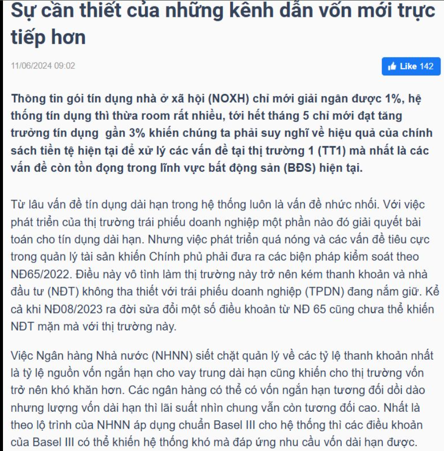 [Sự cần thiết của những kênh dẫn vốn mới trực tiếp hơn] https://vietstock.vn/.../su-can-thiet-cua-nhung-kenh-dan... Thông tin gói tín dụng nhà ở xã hội (NOXH - Nhà ở xã hội) chỉ mới giải ngân được 1%, hệ thống tín dụng thì thừa room rất nhiều, tới hết tháng 5 chỉ mới đạt tăng trưởng tín dụng gần 3% khiến chúng ta phải suy nghĩ về hiệu quả của chính sách tiền tệ hiện tại để xử lý các vấn đề tại thị trường 1 (TT1 - Thị trường bất động sản) mà nhất là các vấn đề còn tồn đọng trong lĩnh vực bất động sản (BĐS) hiện tại.