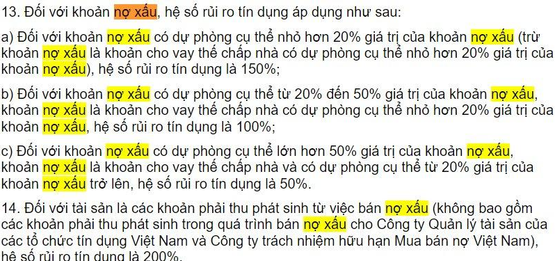 Bài báo này chắc chuyên gia ít nghiên cứu TT41/2016 của NHNN (Ngân hàng Nhà nước). Cụ thể, đã là nợ xấu (nhóm 2 thôi), tức dự phòng cụ thể dưới 20%, thì trọng số rủi ro là 150%. Nếu vậy, xem RWA (Risk-Weighted Assets - tài sản điều chỉnh rủi ro) trong báo cáo CAR (Capital Adequacy Ratio - tỷ lệ an toàn vốn) sẽ thấy nợ xấu được dự phòng thế nào. Mình rất recommend (khuyến nghị) mọi người xem cái này, vì rủi ro còn nằm ở tài sản. Đã là nợ xấu bắt đầu trích lập thì rủi ro cái gì nữa? Càng trích lập nhiều, rủi ro dự phòng trên vốn càng giảm.
