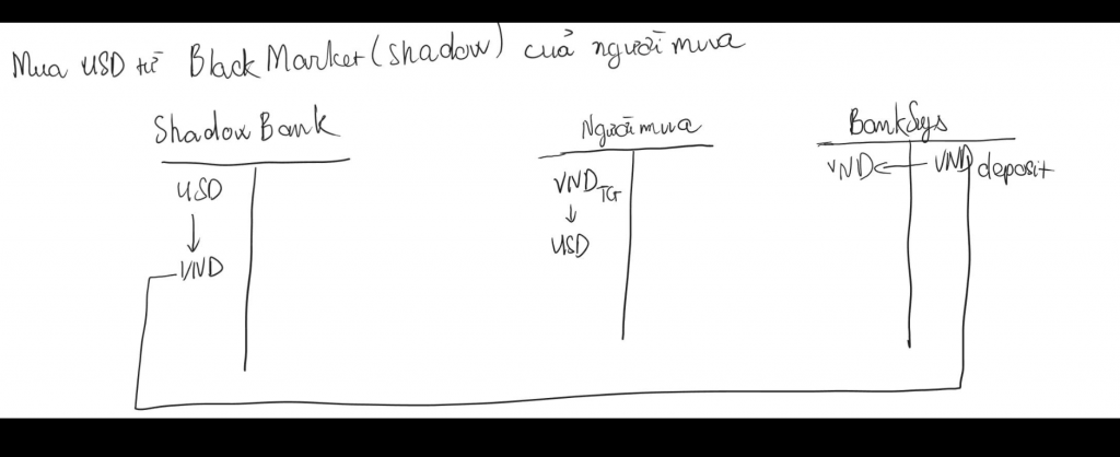 Gần đây thì Gap Bank - Chợ Đen ngày càng cao: Bank hiện tại 26.118-26.358 còn Chợ đen đã là 27.700-27.850. Tức là hoàn toàn nếu mua được ở Bank mà ra chợ thì bán có Arbitrage (Chênh lệch giá - Arbitrage). Để đơn giản thì giả sử các giao dịch VND vẫn in-system thì chúng ta có USDVND (Tỷ giá Đô la Mỹ/Việt Nam Đồng) chợ đen có thể không quá ảnh hưởng tới system này (Hình 1 mô tả quá trình này). Giá USD chợ đen không phải là leading (dẫn dắt - leading) cho market. Đương nhiên nếu USD chợ đen mà tăng cao việc có một lượng USD in-system chạy ra ngoài là hoàn toàn có thể. Thế nên SBV (State Bank of Vietnam - Ngân hàng Nhà nước) mới phải sốt vó lên, nếu gap này càng lớn càng incentive (kích thích - incentive) cho quá trình này. Nên tóm lại là cần ngăn. Nhưng vấn đề nó không chỉ đơn giản mỗi chỗ đó. Nếu USD chợ đen lên ấy nó còn incentive cho một cái hành động khiến cho system đau đầu hơn, đó chính là đầu cơ USD và càng kéo dãn gap này.