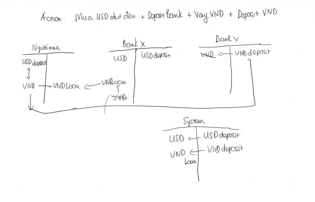 Cái này hoàn toàn không liên quan gì tới FX Reserve (Dự trữ ngoại hối - Foreign Exchange Reserves) cả nhé, ngược lại nó còn có lợi cho FX Reserve vì tăng thêm USD in system ấy. Nhưng nó sẽ khiến hệ thống có deposit với kỳ hạn ngắn lại do việc chuyển từ VND deposit sang USD deposit và quá trình này kết hợp với mấy rule (quy định - rule) gần đây về việc chuyển khoản 500 triệu chẳng hạn thì việc cash-in-hand (tiền mặt trong tay) cao lại càng khiến LS VND tăng. ( Hình 2 mô tả quá trình này )