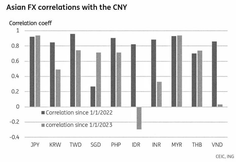Từ đầu năm 2022, Fed (Cục Dự trữ Liên bang Mỹ) nâng lãi suất với tần suất cao và mức lớn, khiến các đồng tiền đồng pha (cùng xu hướng) giảm so với USD (against USD). Nên tự nhiên lại có sự tương quan (correlate) như hình dưới. Nhưng từ đầu năm 2023, trong khi USD/CNY tiếp tục giảm 4.3%, thì USD/VND gần như đứng yên. Gần đây, SBV (Ngân hàng Nhà nước) tiếp tục hạ lãi suất, làm chênh lệch (gap) USD/VND âm hẳn. Dẫn đến áp lực tỷ giá cực lớn. Giờ ngồi xem USD/VND trụ được tới bao lâu, chắc cũng sẽ giống năm ngoái thôi.