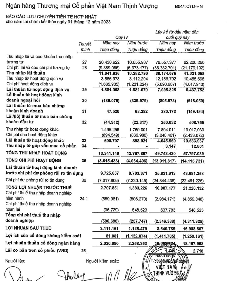 Tín dụng tăng gần 30%, đi cùng với cân đối tài chính. Thực ra, chi phí tín dụng nếu tính tương đương cũng chẳng có gì hot, chỉ tăng khoảng 3-4k (3-4 nghìn tỷ VND), hợp nhất phần FE (FE Credit) thì cũng chỉ tăng thêm 2k (2 nghìn tỷ VND). Trong khi đó, năm 2022, VPBank đã nhận khoản tiền khủng từ vụ bán FE rồi, nên mới có chuyện lợi nhuận cao vậy. Nếu loại bỏ khoản hạch toán lợi nhuận từ FE, thì PL (Profit & Loss - lợi nhuận) cũng không bị ảnh hưởng nhiều.