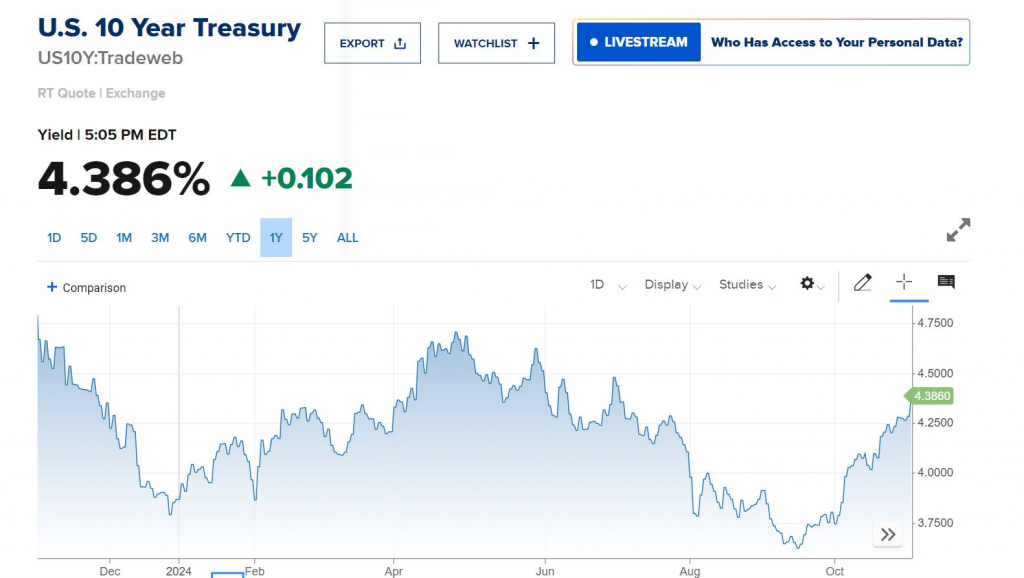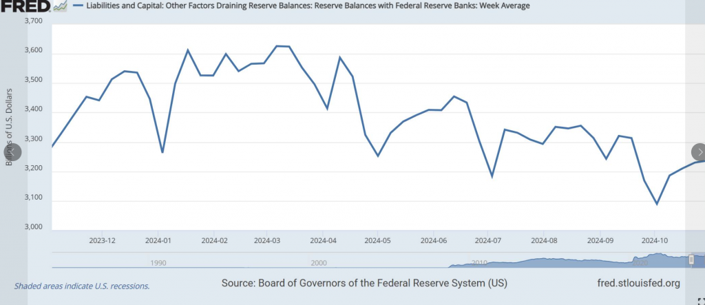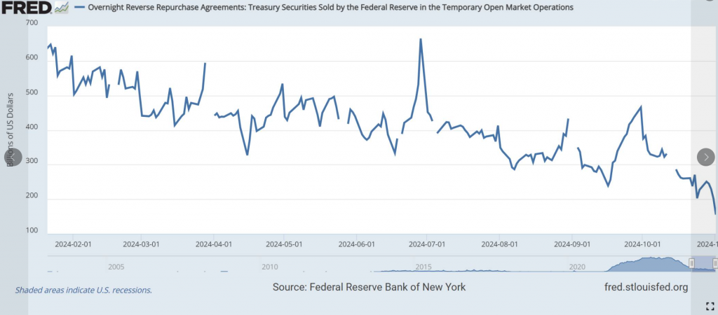 Hôm qua, ngay khi tin NFP (Non-Farm Payroll – số liệu việc làm phi nông nghiệp) công bố (chỉ 12k so với ước tính 113k), điều này càng củng cố rate-track (dự báo lãi suất) từ Fed (Cục Dự trữ Liên bang Mỹ) sẽ tiếp tục giảm 25 bps (điểm cơ bản) trong tháng 11. Nhưng lạ là nó chẳng ảnh hưởng gì tới việc Bond Yield (lợi suất trái phiếu) tiếp tục tăng lên level (mức) mới gần 4.4% cho kỳ hạn 10 năm (level 10Y). Không chỉ vậy, tất cả các level fixing (lãi suất cố định) đều tăng mạnh, chứ không riêng ai. Điều này nói thật cũng chẳng có gì phi lý. Vì bản thân thanh khoản co hẹp trên toàn cầu, khi quyết định lãi suất không đi kèm với lượng tiền được bơm ra, mà ngược lại, hạ lãi suất đi kèm hút tiền (xem thêm tại đây: https://shorturl.at/KGFK0). Chung quy thì thanh khoản dư trên cân đối của các bên cũng giảm, chứ chẳng tăng gì. Từ RB (Reserve Balances – dự trữ ngân hàng) cho tới RRP (Reverse Repurchase Agreement – giao dịch mua lại đảo ngược), thanh khoản đều co hẹp cả (xem Hình 3-4). RRP chỉ còn đâu đó hơn 155 bio (155 tỷ USD), giảm một nửa so với 1 tháng trước – quá hợp lý khi yield tăng hơn 50 bps trong 1 tháng qua ở tất cả các kỳ hạn. Quá trình correction (điều chỉnh) aka adjusted (được điều chỉnh) này sẽ kết thúc khi lượng RRP này về 0, gợi ý cho thời điểm Normalization (bình thường hóa) của Fed kết thúc.