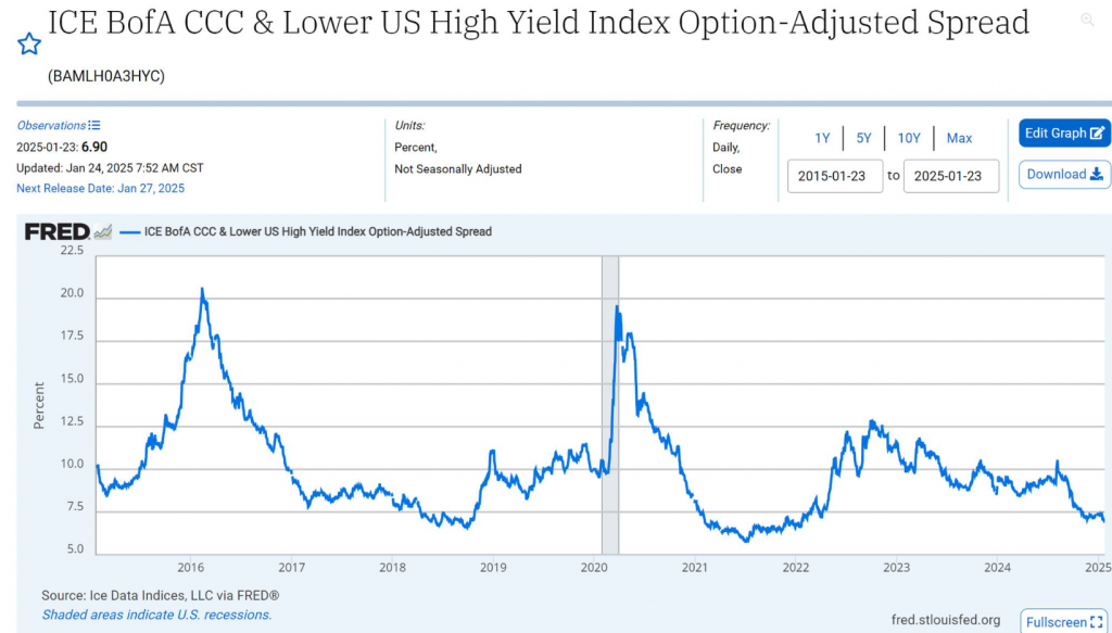 Chính ra nhé, cái mà mình hay lấy làm key indicator (chỉ số quan trọng) cho risky asset nói chung là CCC-spread (chênh lệch lợi suất trái phiếu hạng CCC) đang giảm khủng khiếp từ cuối 2022 tới hiện tại (hiện tại là 6.9%, ngang thời kỳ đầu 2022). Và ngạc nhiên hơn, nó chưa có dấu hiệu dừng lại. Chắc chắn điều này có khả năng chưa dừng khi mà central bank (ngân hàng trung ương) nhìn chung đang thu hẹp cân đối (balance sheet).