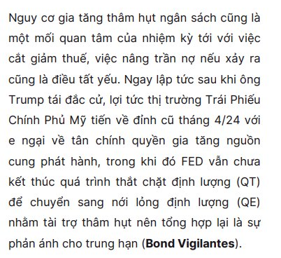 Thực tế, điều này không khó giải thích. Hiện tượng này được gọi là Bond Vigilante (nhà đầu tư trái phiếu phản kháng). Nói ngắn gọn, vì lạm phát cao, họ cần mức yield cao hơn để defense (bảo vệ), đâm ra những quả bond có yield thấp sẽ bị loại đầu tiên. Nhất là trong bối cảnh thâm hụt của US (Hoa Kỳ) như hiện nay, rồi giảm thuế, đủ thứ của Trump, việc rolling (gia hạn) đống UST (trái phiếu kho bạc Mỹ) càng ngày càng khó. Và đương nhiên, YTM của UST sẽ tăng lên. Đoạn này cũng giới thiệu một góc nhìn thú vị trong report (báo cáo) mới đọc của SHS (Công ty Chứng khoán Sài Gòn – Hà Nội).