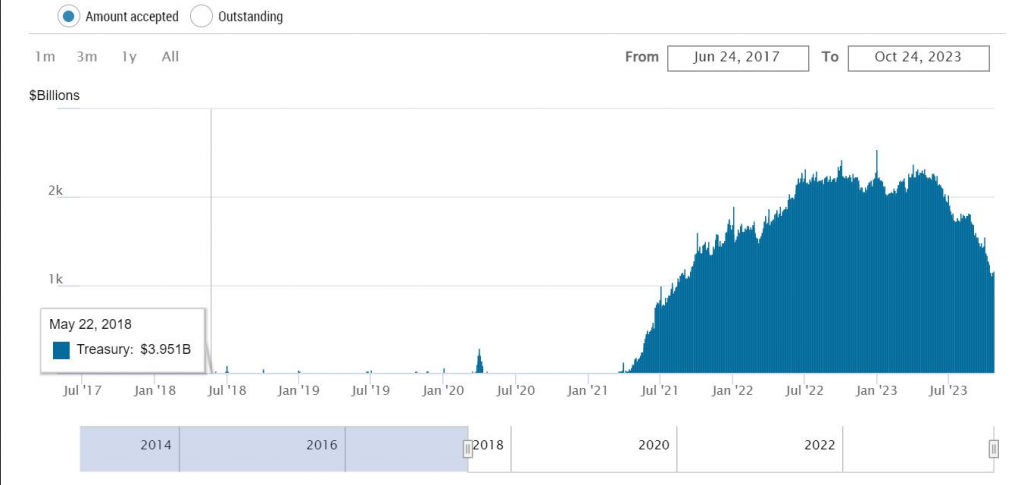 Hãy xem RRP (Reverse Repurchase Agreement) của FED: họ đang giữ gần 1.1 triệu tỷ USD ở mức lãi suất 5.3%. Với thanh khoản thế này, cuộc chiến lạm phát còn dài. Không trách họ cảnh báo lãi suất cao dài hạn. (Hình 2)
