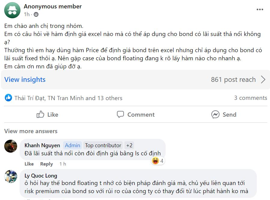 Tóm lại: Khi mua trái phiếu thả nổi, bạn đã chịu rủi ro lãi suất của các kỳ sau, khi lãi suất được chỉnh lại, chẳng có gì phức tạp cả. Và không ai dùng hàm PRICE trong Excel để định giá trái phiếu thả nổi đâu. Vậy thôi. Khi sàn trái đi vào hoạt động, mình không biết bên nào sẽ chịu phần fixed lại giá này, nếu không, mọi cách quote giá cố định cho trái phiếu thả nổi sẽ trở thành vô nghĩa.