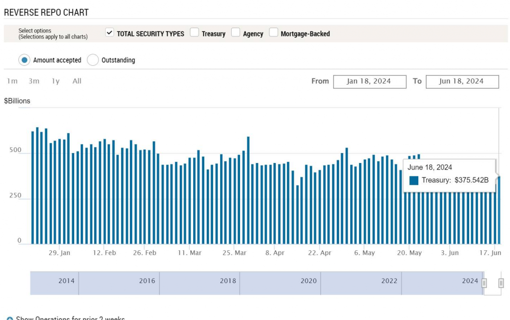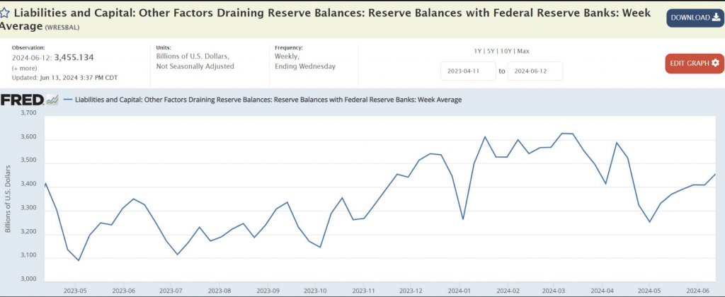 Giờ muốn thấy cut (cắt) lãi suất lần đầu, thanh khoản không được dư thế này. Hiện tại, RB = 3.45 nghìn tỷ USD, đang tăng và quay lại mức đầu tháng 3, còn RRP = 375 tỷ USD, gần như không đổi, chỉ giảm khoảng 50 tỷ USD (50 bio) so với 2 tháng trước. Với việc hạ pace (tốc độ) roll từ 60 tỷ xuống 25 tỷ như vậy, thì phải tới “mùng thất” (lâu lắm) mới xong QT (Quantitative Tightening - thắt chặt định lượng). Mình prefer (thích) xem RRP vì tính thanh khoản tuyệt đối của nó, so với lần QT trước (nó phải cận 0).