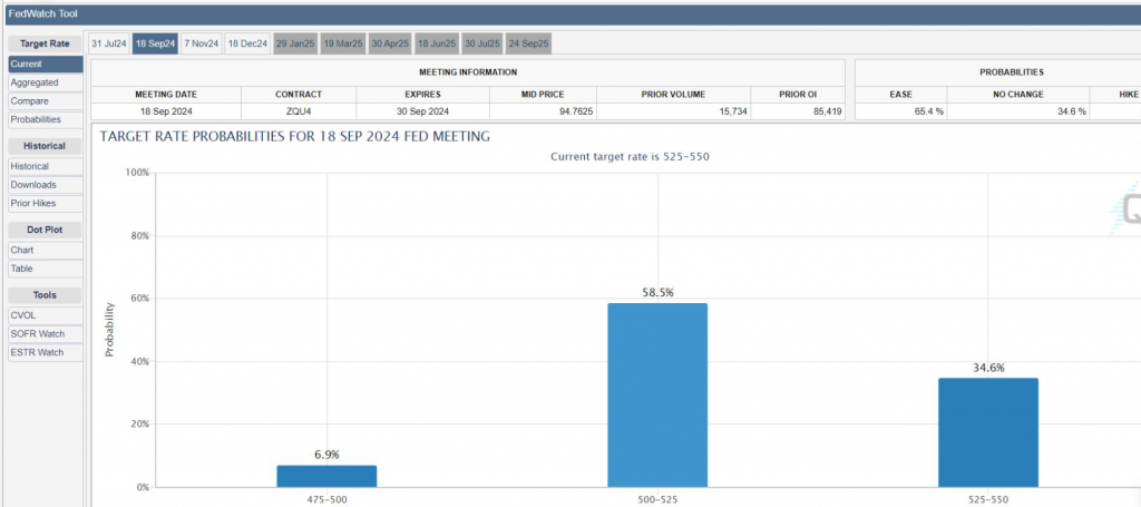 Quay lại logic của mình, mình nghĩ first cut (lần cắt lãi suất đầu tiên) trong năm nay có lẽ không phải tháng 9. Dù sao, có phải hay không thì mình cũng win (thắng). Đương nhiên không nhờ may mắn gì cả. Nói thật, lúc mình bet cái kèo trên CME Watch (công cụ dự đoán lãi suất của CME), tháng 6 hạ lãi suất xác suất tận 70%, giờ tháng 9 hạ chỉ còn 60% thôi.