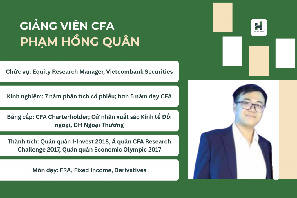 Anh Phạm Hồng Quân hiện là Equity Research Manager tại Vietcombank Securities Company, sở hữu 7 năm kinh nghiệm trong lĩnh vực phân tích cổ phiếu và từng đảm nhiệm nhiều vai trò tại Vietcombank Securities Company và Saigon Securities Inc. (SSI). Với hơn 5 năm kinh nghiệm giảng dạy CFA, anh Phạm Hồng Quân đã khẳng định năng lực truyền đạt kiến thức chuyên sâu, gắn liền lý thuyết với thực tiễn.
