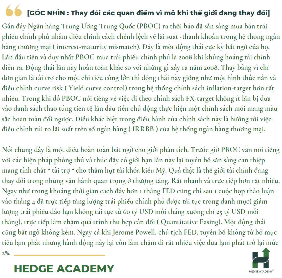 Nói chung, đây là điều bất ngờ với giới phân tích. Trước giờ, PBOC nổi tiếng với biện pháp phòng thủ và thúc đẩy có giới hạn, giờ lại tuyên bố can thiệp mang tính “tài trợ” cho thâm hụt tài khóa kiểu Mỹ. Quả thật, thế giới tài chính đang thay đổi trong những vận hành quan trọng ở thượng tầng – rất nhanh và trực tiếp hơn nhiều. Ngay cả cách đây hơn một tháng, FED (Cục Dự trữ Liên bang Mỹ) sau một cuộc họp tháng 4 đã trực tiếp tăng lượng trái phiếu chính phủ tái tục trong danh mục, giảm lượng trái phiếu đáo hạn không tái tục từ 60 tỷ USD mỗi tháng xuống còn 25 tỷ USD, làm chậm quá trình thu hẹp cân đối (Quantitative Easing - nới lỏng định lượng). Động thái này cũng bất ngờ không kém. Dù Jerome Powell, Chủ tịch FED, tuyên bố không từ bỏ mục tiêu lạm phát 2%, hành động này lại làm chậm việc đưa lạm phát về mức đó.