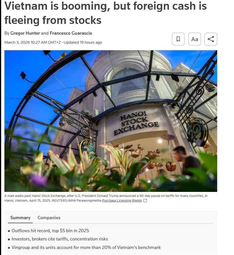 Đấy là nội dung chính của một bài báo trên Reuters nói đại khái: Thị trường nâng hạng đấy nhưng nhà đầu tư chạy hết, rủi ro tập trung to quá không ai gánh nổi. Đúng là đã xấu nó đến đông như chim nhợn chờ đưa thư cho Harry Bồ Tèo nhưng mà lại bị nhà Dursley ngăn lại. Phải nói bài báo rất thuyết phục bằng cách bồi thêm 1 fact: