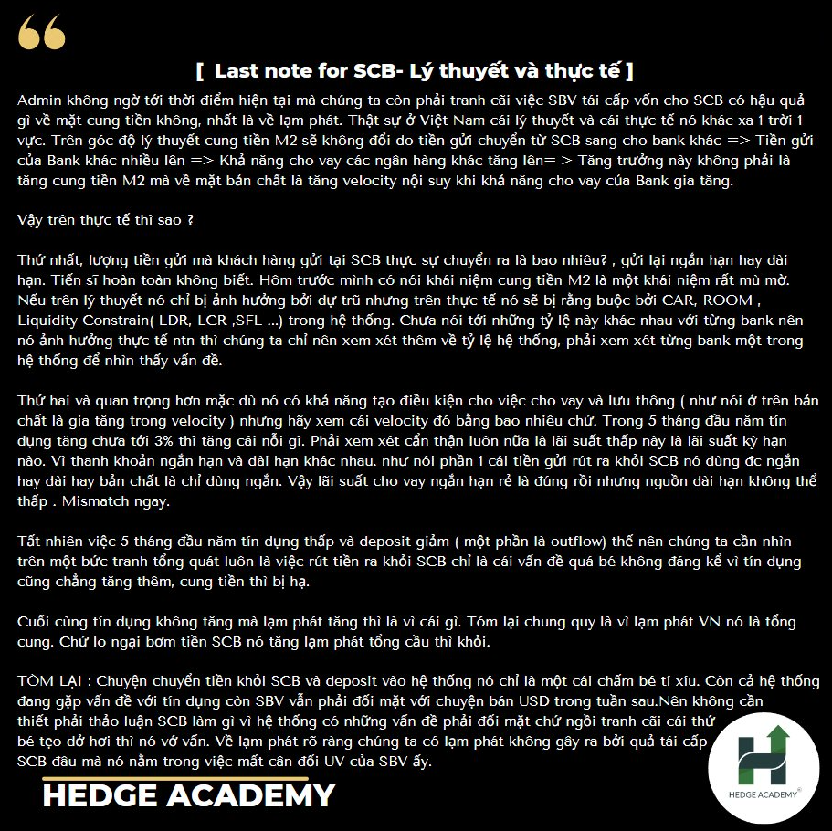 Thứ nhất, lượng tiền gửi khách hàng rút ra từ SCB thực sự là bao nhiêu? Gửi lại ngắn hạn hay dài hạn? Người đứng ngoài hoàn toàn không biết. Hôm trước mình đã nói khái niệm cung tiền M2 rất mù mờ. Trên lý thuyết, nó chỉ bị ảnh hưởng bởi dự trữ bắt buộc, nhưng thực tế bị ràng buộc bởi CAR (Capital Adequacy Ratio - tỷ lệ an toàn vốn), ROOM (phòng trống tăng trưởng), Liquidity Constrain (ràng buộc thanh khoản như LDR - Loan-to-Deposit Ratio, LCR - Liquidity Coverage Ratio, SFL - Short-term Funding for Long-term Lending) trong hệ thống. Chưa kể, các tỷ lệ này khác nhau giữa các bank, nên ảnh hưởng thực tế ra sao chỉ nên xem xét thêm tỷ lệ hệ thống, phải nhìn từng bank một để thấy vấn đề.