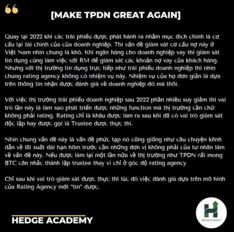 Nhìn chung, vấn đề này phức tạp, giống như câu chuyện kênh dẫn lãi suất dài hạn hôm trước, cần những đơn vị không phải tư nhân làm việc này. Nếu làm lại thị trường TPDN (trái phiếu doanh nghiệp), rất mong BTC (Ban Tổ chức) cân nhắc thành lập Trustee thay vì chỉ tập trung vào rating agency.