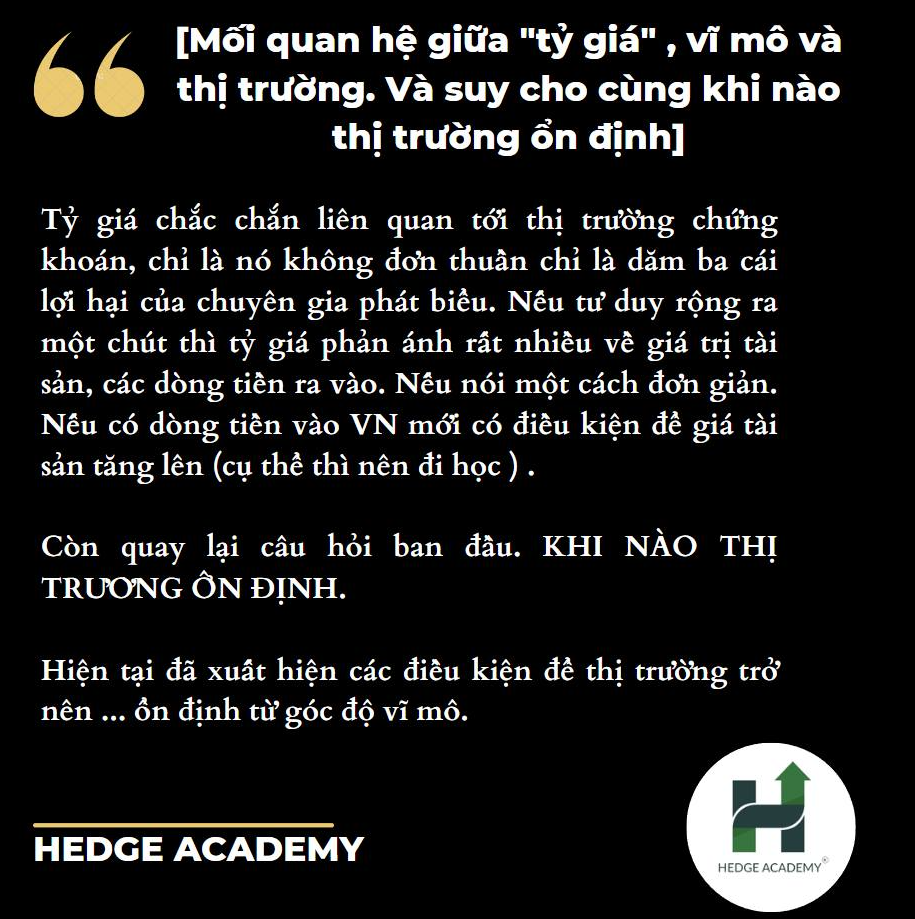 Vậy nên, hãy tư duy rộng hơn. Tỷ giá chắc chắn liên quan đến thị trường chứng khoán, nhưng không đơn thuần là mấy ý lợi hại của chuyên gia phát biểu. Nếu nghĩ rộng, tỷ giá phản ánh nhiều về giá trị tài sản, dòng tiền ra vào. Nói đơn giản, có dòng tiền vào Việt Nam thì giá tài sản mới tăng (muốn hiểu cụ thể thì nên đi học).
