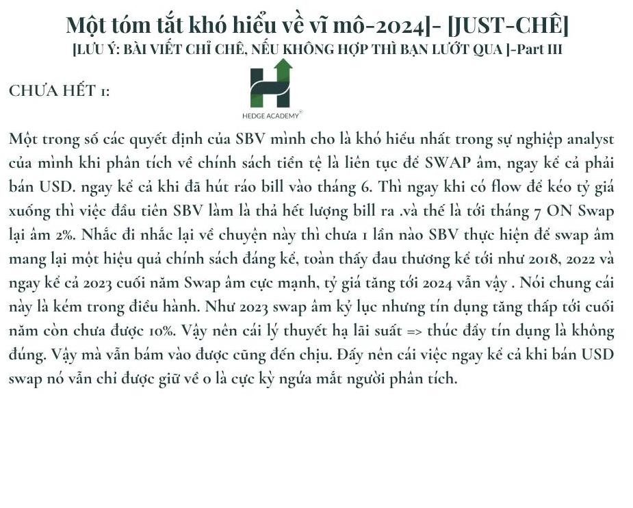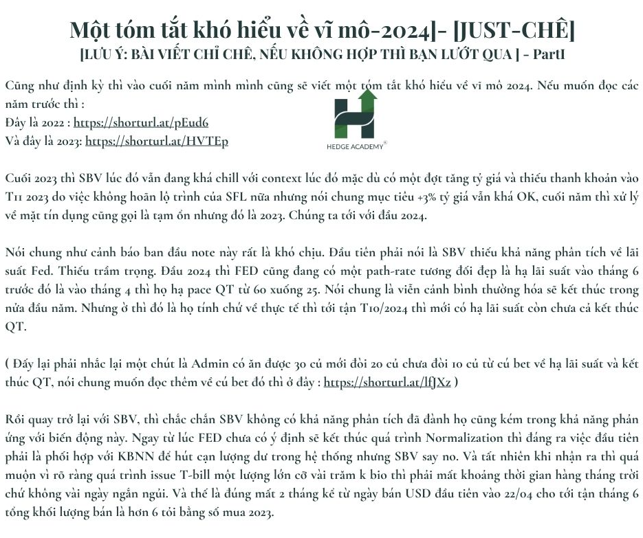 Cuối 2023, SBV (Ngân hàng Nhà nước Việt Nam) lúc đó vẫn khá chill (thư giãn) với context (bối cảnh) lúc đó, dù có đợt tăng tỷ giá và thiếu thanh khoản vào tháng 11/2023 do không hoãn lộ trình SFL (Stable Funding Liquidity – thanh khoản tài trợ ổn định) nữa. Nhưng nói chung, mục tiêu +3% tỷ giá vẫn khá OK, cuối năm xử lý tín dụng cũng tạm ổn – nhưng đó là 2023. Bây giờ ta tới với đầu 2024.