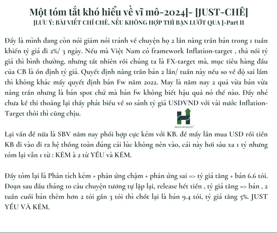 Đấy là mình đang còn nói giảm nói tránh về chuyện họ 2 lần nâng trần bán trong 1 tuần, khiến tỷ giá đi 2%/3 ngày. Nếu Việt Nam có framework (khung quản lý) inflation-target (mục tiêu lạm phát), thả nổi tỷ giá thì bình thường, nhưng tất nhiên rồi, chúng ta là FX-target (mục tiêu tỷ giá), mục tiêu hàng đầu của central bank (ngân hàng trung ương) là ổn định tỷ giá. Quyết định nâng trần bán 2 lần/tuần này, nếu so về độ sai lầm, không khác mấy quyết định bán forward (hợp đồng tương lai) năm 2022. May là năm nay 2 quả vừa bán vừa nâng trần, nhưng là bán spot (giao ngay), chứ bán fw không biết hậu quả thế nào. Đấy nhé, chưa kể thi thoảng lại thấy phát biểu so sánh tỷ giá USDVND với vài nước inflation-target, thôi thì cũng chịu.