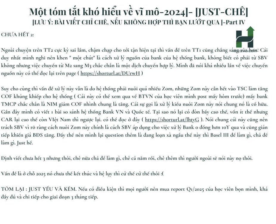 Suy cho cùng, vấn đề xử lý này vẫn là do hệ thống phải nuôi quá nhiều zom (zombie – doanh nghiệp zombie), những zom này cắn hết vào TSC (tài sản có), làm tăng COF (Cost of Funds – chi phí vốn) khủng khiếp cho hệ thống. (Cái này có thể xem qua BTVN của học viên mình post mấy hôm trước.) Mấy ngân hàng TMCP (thương mại cổ phần) chắc chắn NIM (Net Interest Margin – biên lãi ròng) giảm, COF nói chung tăng. Cái sự gọi là xử lý kiểu nuôi zom này nói chung là cố hữu. Gần đây mình có viết một bài so sánh hệ thống ngân hàng Việt Nam và quốc tế: Tại sao họ đòn bẩy cao thế, vốn ít thế nhưng CAR (Capital Adequacy Ratio – tỷ lệ an toàn vốn) lại cao thế, còn Việt Nam thì ngược lại. Có thể đọc ở đây (https://shorturl.at/lhtyG). Nói chung, cái này cũng nên trách SBV, vì rõ ràng cách nuôi zom này chính là cách SBV áp dụng cho việc xử lý bank 0 đồng hơn 10 năm qua, và gián tiếp khiến giá BĐS (bất động sản) tăng. Đấy, thế nên mình lại question (đặt câu hỏi) thêm: Đang loạn xà ngầu thế này, Basel III để làm gì? Chả để làm gì. Just hề.