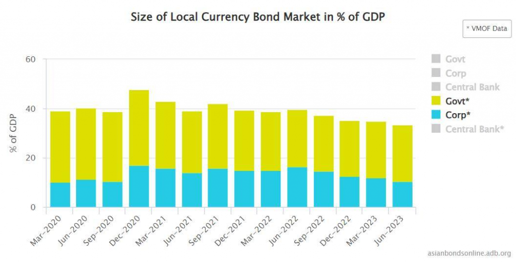 Đã có lúc TPDN (trái phiếu doanh nghiệp) chiếm đâu đó 18% GDP, nhưng giờ thu hẹp còn 10.5%. Mình thấy thú vị ở chỗ outstanding (dư nợ) giảm cực nhanh, từ 63 tỷ USD đỉnh điểm tháng 6 năm ngoái, giờ còn 44 tỷ USD – tức là gần 20 tỷ USD trái phiếu đã được cơ cấu chỉ trong 1 năm (khoảng 450 nghìn tỷ VND). Con số này khủng thật! Tốc độ cơ cấu trái phiếu nhanh hơn xử lý nợ xấu hồi 2013 nhiều.